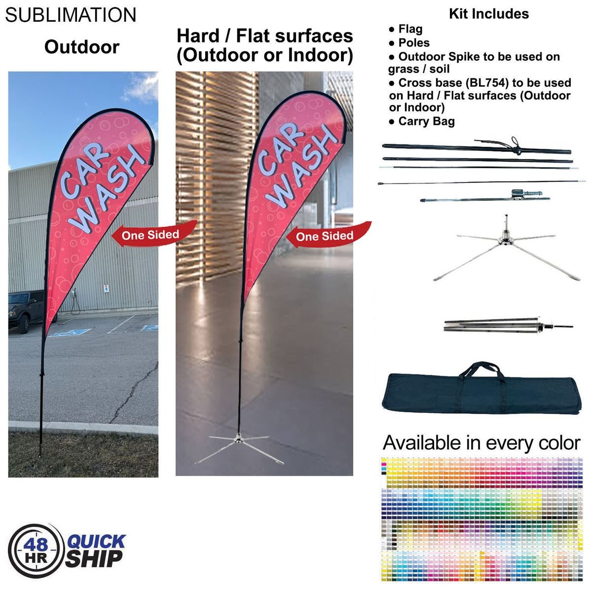 12′ Medium Tear Drop Flag Kit, Single Side, Spike base for outdoor use, Cross base for indoor / outdoor use on hard suface and Carry Bag are Included. This Kit can be used outdoors and indoors. Fabric Tear Drop Flag includes Full Color Graphics One Sided.