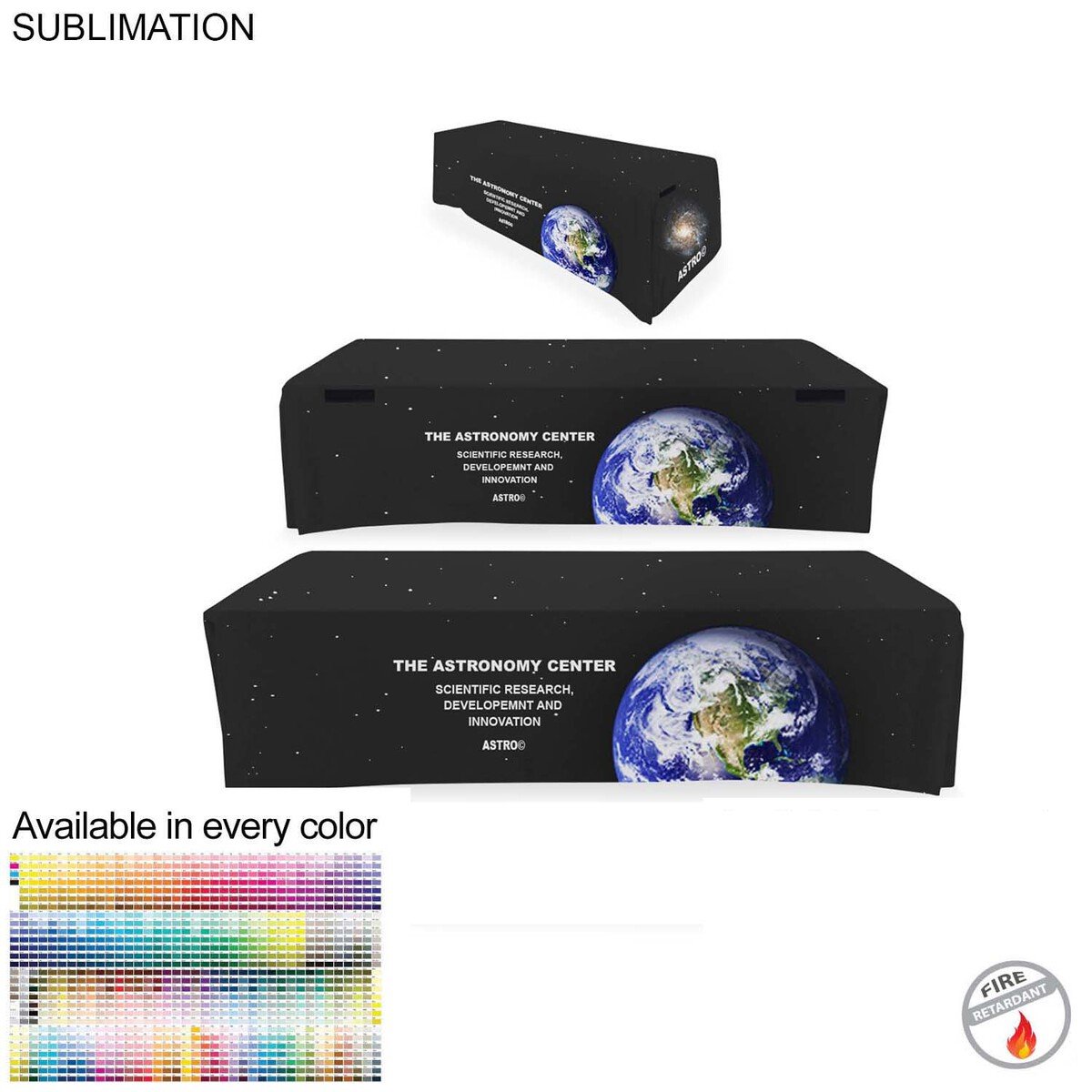 Standard production time for this sku. ; 8′ LazerCut 3-Sided PREMIUM Sublimated Tablecloth, Drape Style, Open Back.; 100% polyester, machine washable, wrinkle resistant, fire retardant (FR rated for exhibit halls). Serged Edge.; Size: 152″ x 60”L
